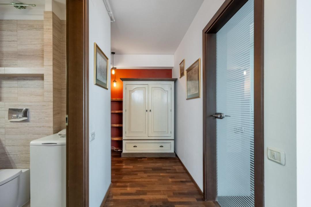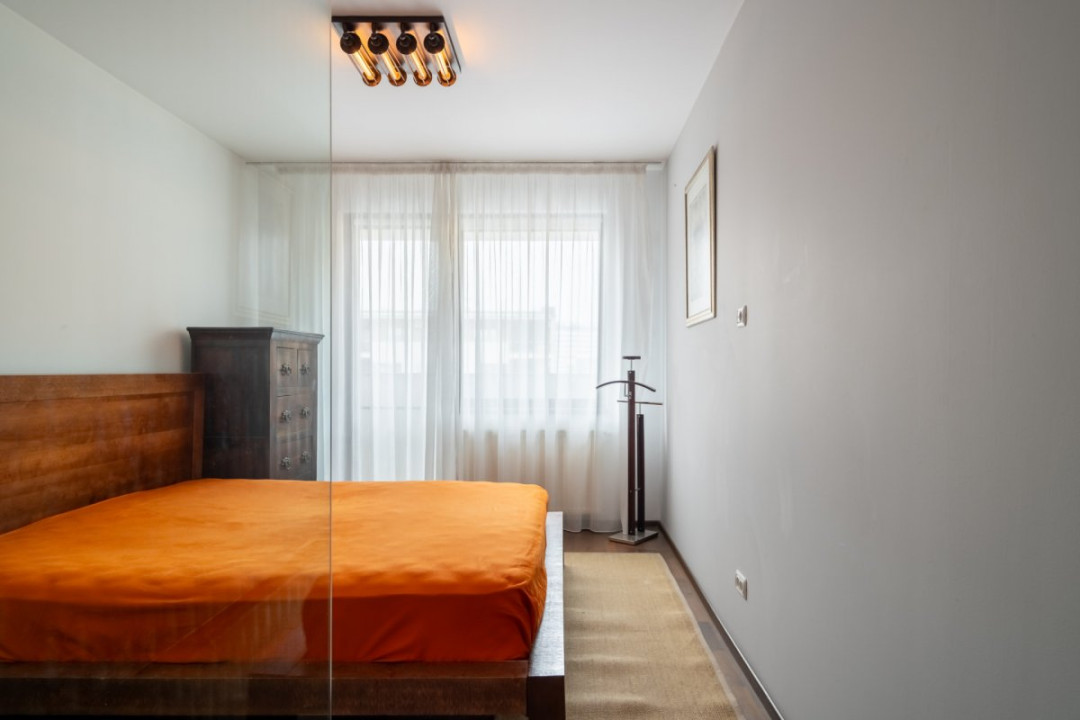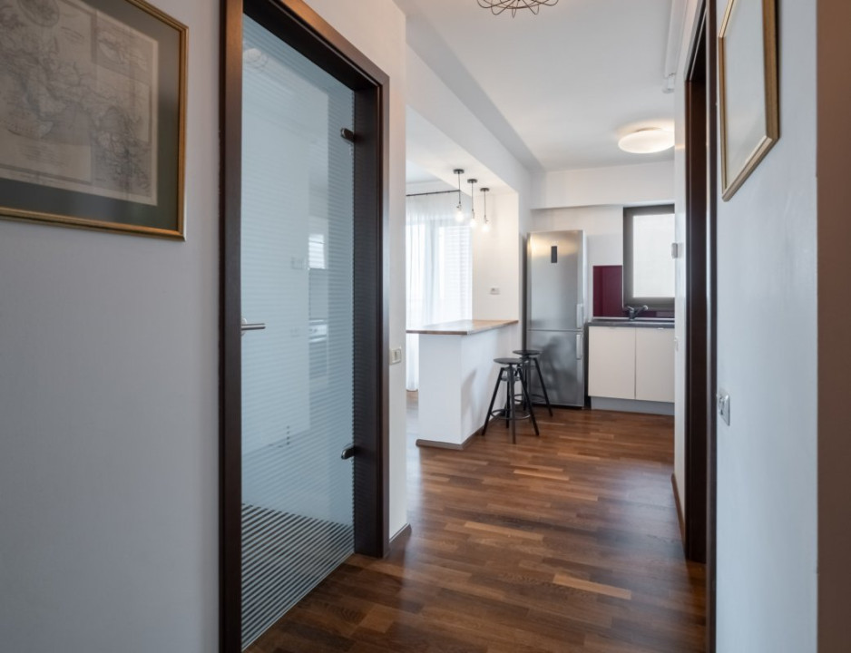 In holul spatios de 9.60mp ai spatiu pentru amenajarea cuierului si a unor depozitari utile. In camera de zi (17mp) este suficient loc pentru a aduna cativa prieteni o sueta, sau la a sta in jurul mesei de bar din bucatarie (7mp), la un pahar de vin. In dormitorul de 15mp a fost amenajat in mod ingenios un dressing, astfel incat sa nu mai ocupi spatiul cu alte dulapuri.