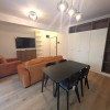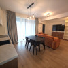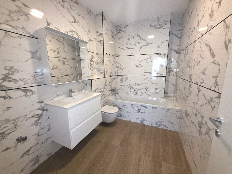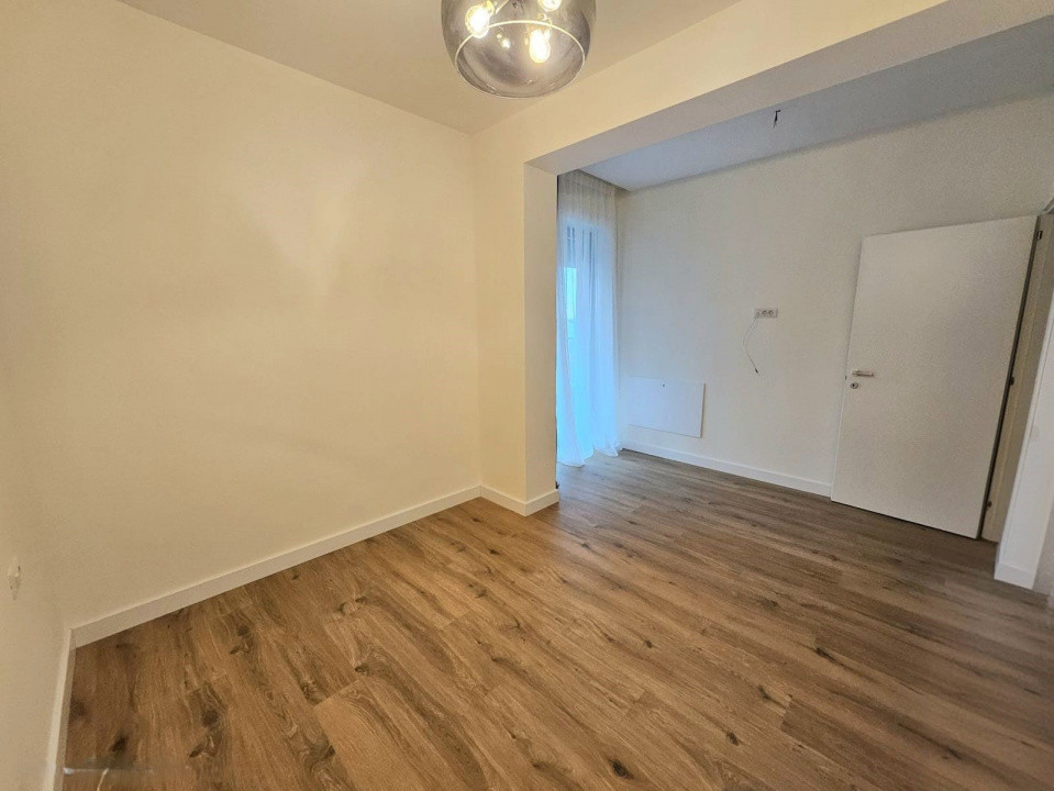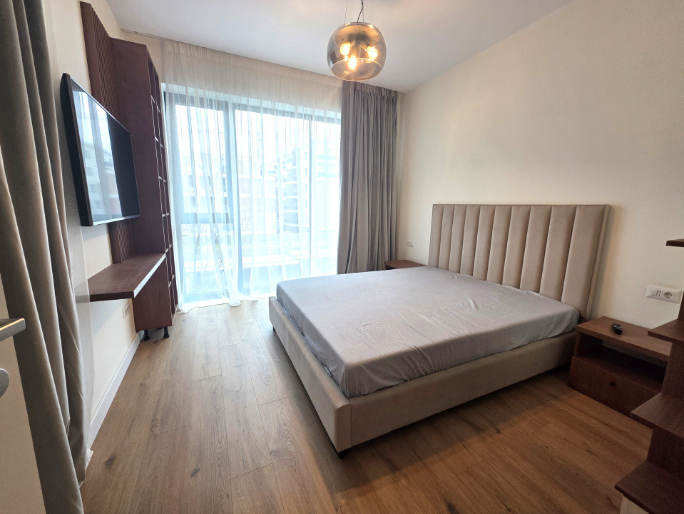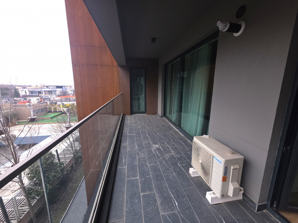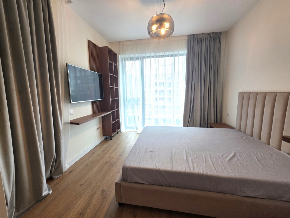 Designul modern se regăsește și în interior: finisajele sunt de cea mai bună calitate, iar mobilierul este nou. Bucătăria este realizată la comandă și complet echipată cu electrocasnice FRANKE. Compartimentarea este gândită pentru un confort sporit, fiind ideală atât pentru o familie cu copii, cât și pentru un cuplu care își dorește o cameră suplimentară pentru birou sau oaspeți. Există un dormitor matrimonial, iar al doilea dormitor dispune de baie proprie.
