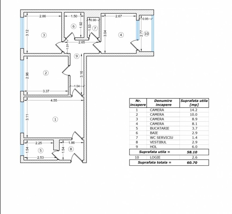 Imobil construit în anul 1973, apartamentul beneficiază de o suprafață utilă totală de 60,7 mp și o compartimentare semidecomandată, ideală pentru familii sau pentru cei care doresc delimitarea eficientă a spațiilor.