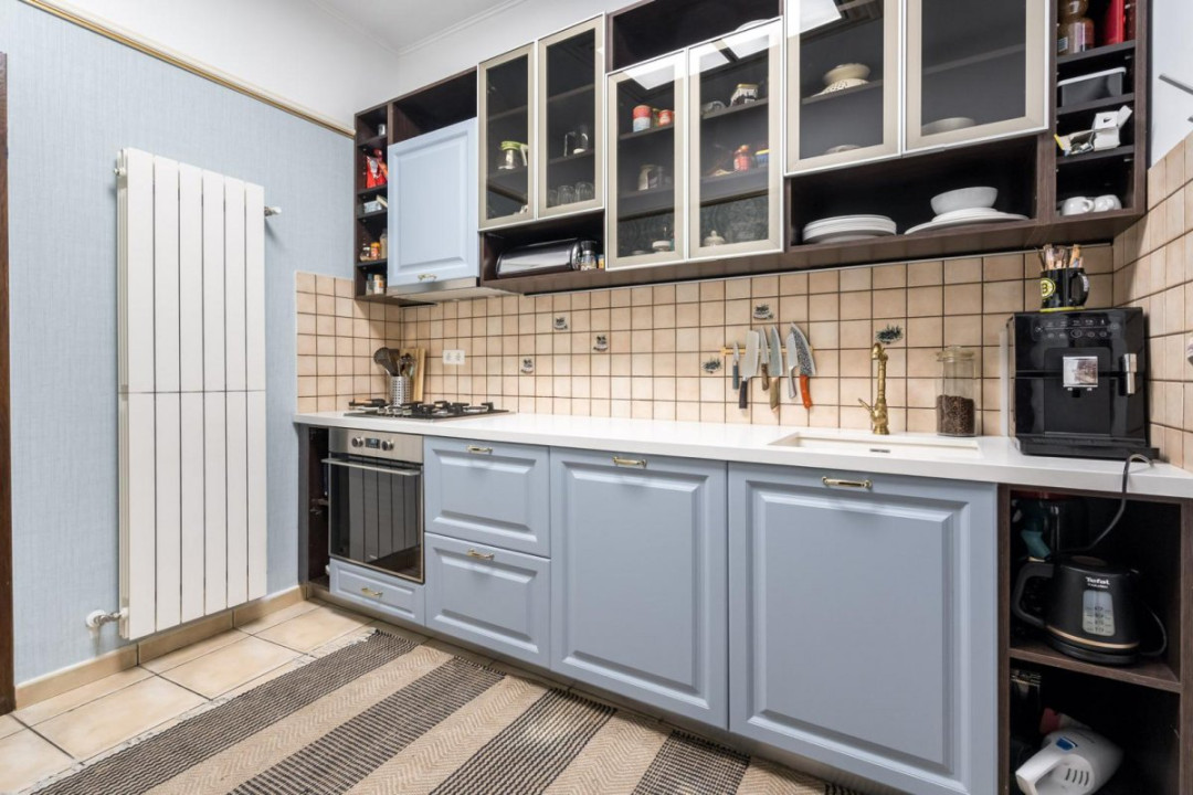 Apartamentul este total mobilat si utilat, are suprafata de 190 mp, 6 camere, 2 camere tip dressing, bucataria cu camara si centrala termica, 3 bai cu fereastra, tavanului este inalt de 3 m, iar balconul transformat intr-o camera-seif.