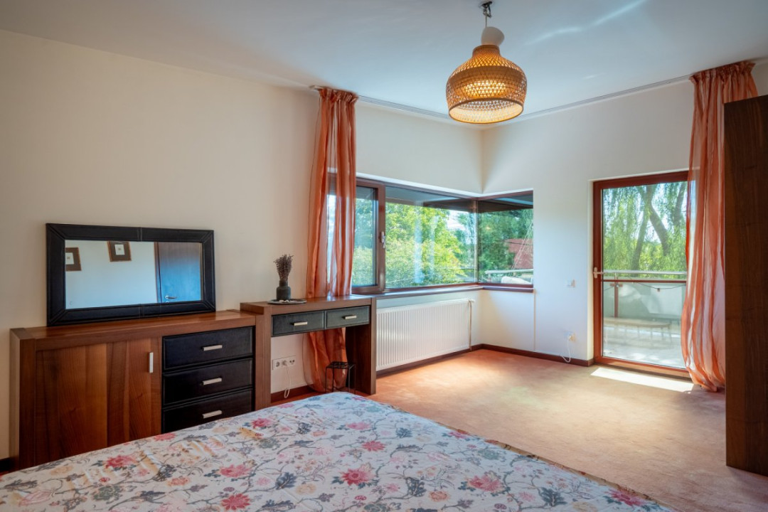 Casa este dispusa pe parter si etaj, avand dormitoare foarte spatioase, unul la parter si doua la etaj, suprafete vitrate mari, intimitate si eleganta.