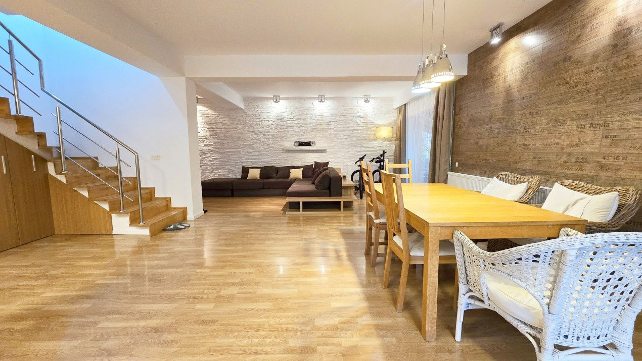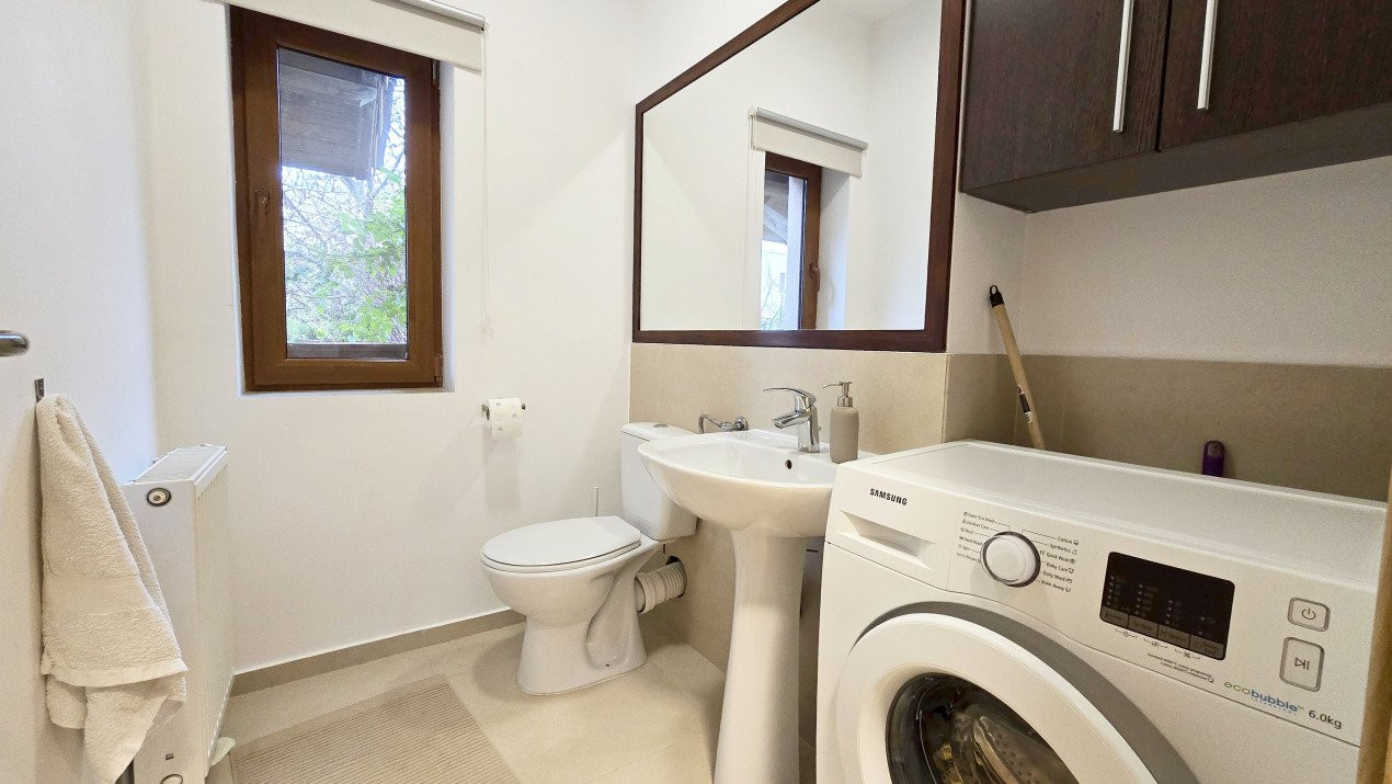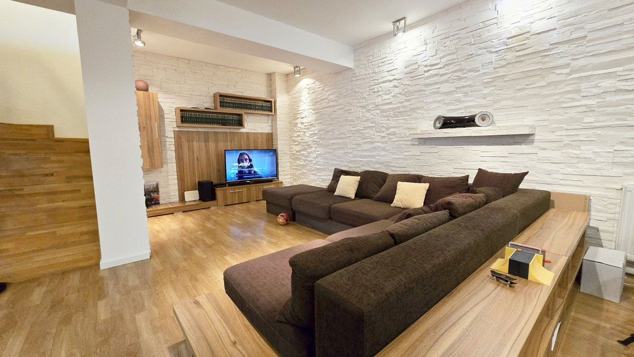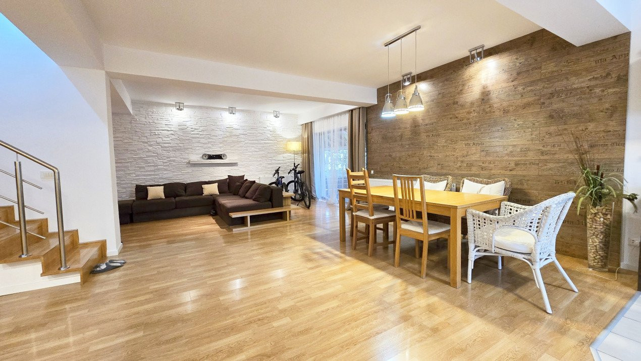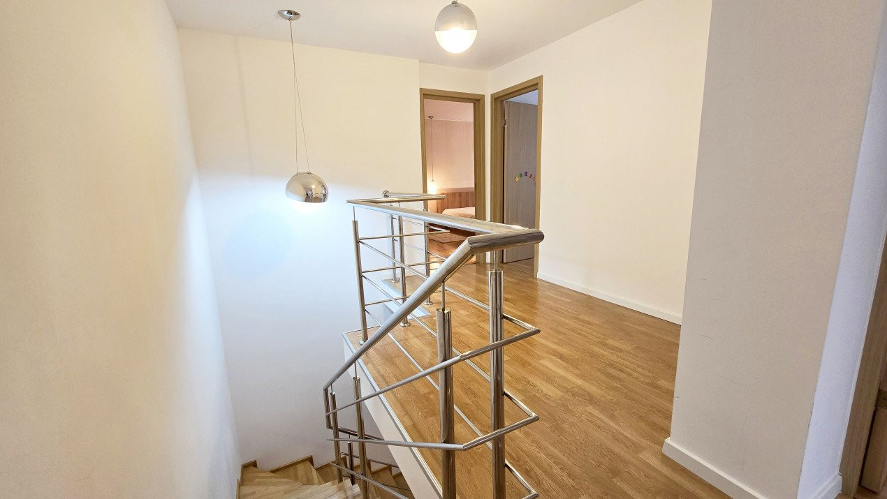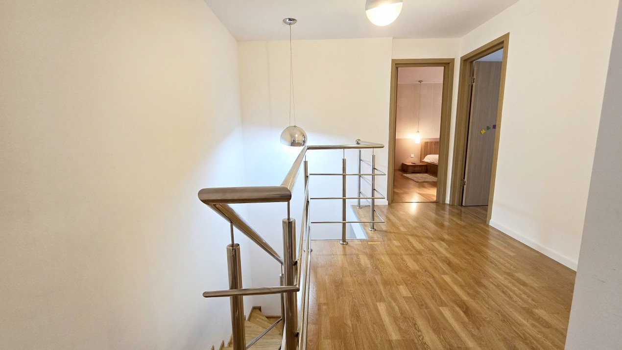 Altfel, casa, pe cat de generoasa si confortabila, este pe atat de intima, atat cat isi doreste orice familie doritoare de liniste si confort sporit. Caci, in completarea livingului imens cu bucatarie deschisa si echipata complet, a dinning-ului si grupului sanitar de la parter, se regasesc la etaj doua dormitoare individuale, o baie si un dormitor matrimonial cu baie proprie, toate in aceeasi nota reconfortanta.