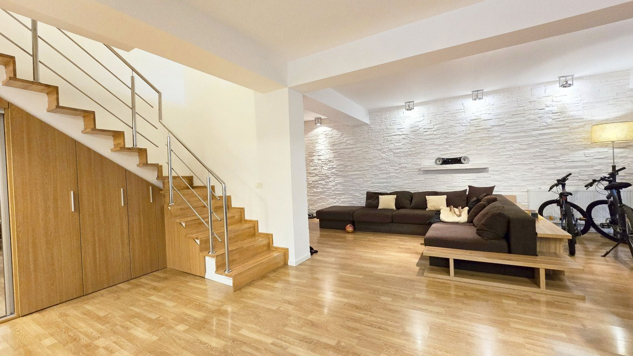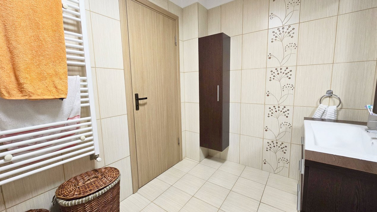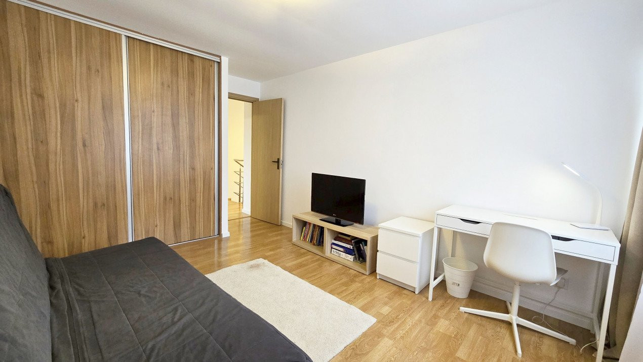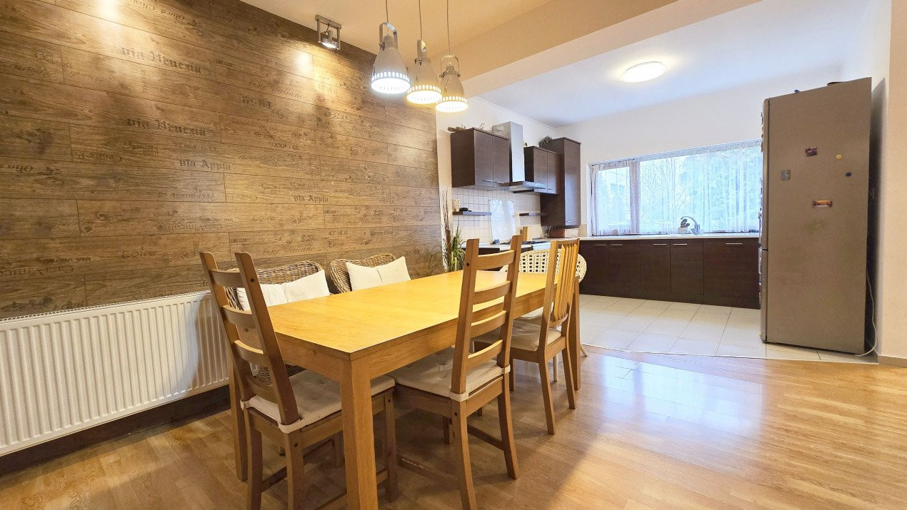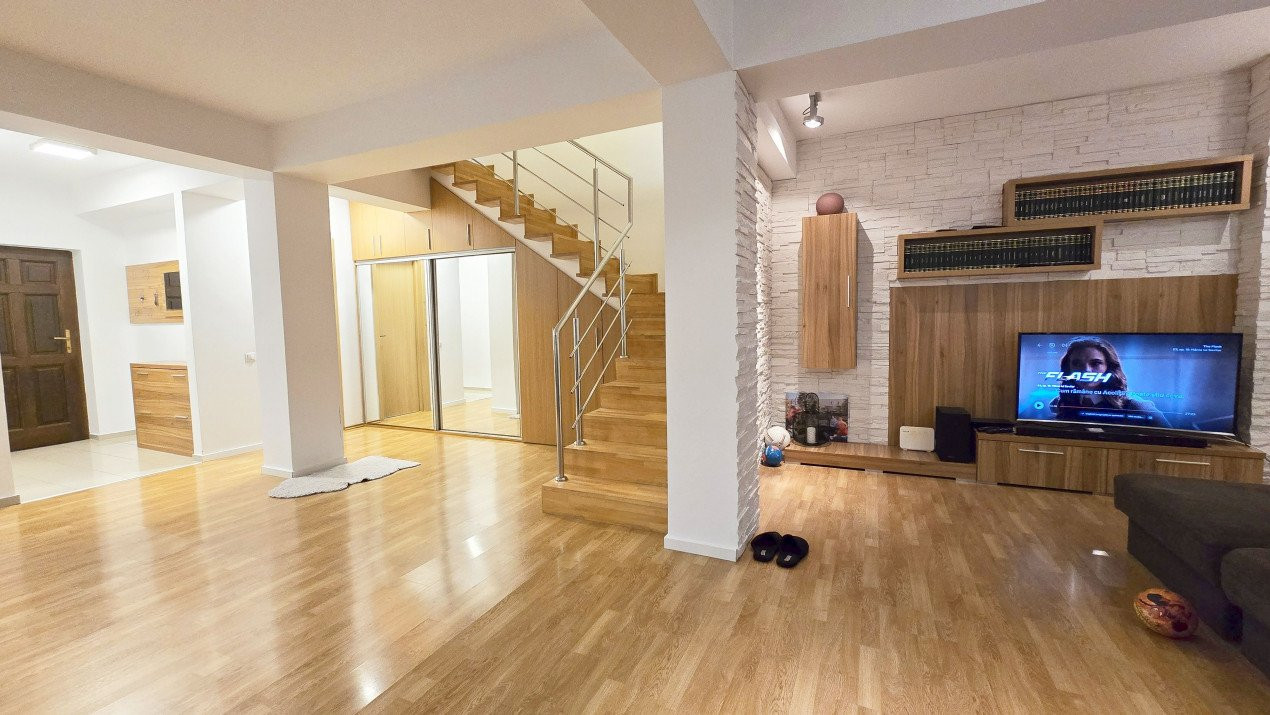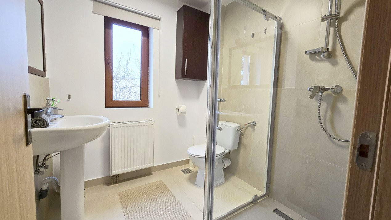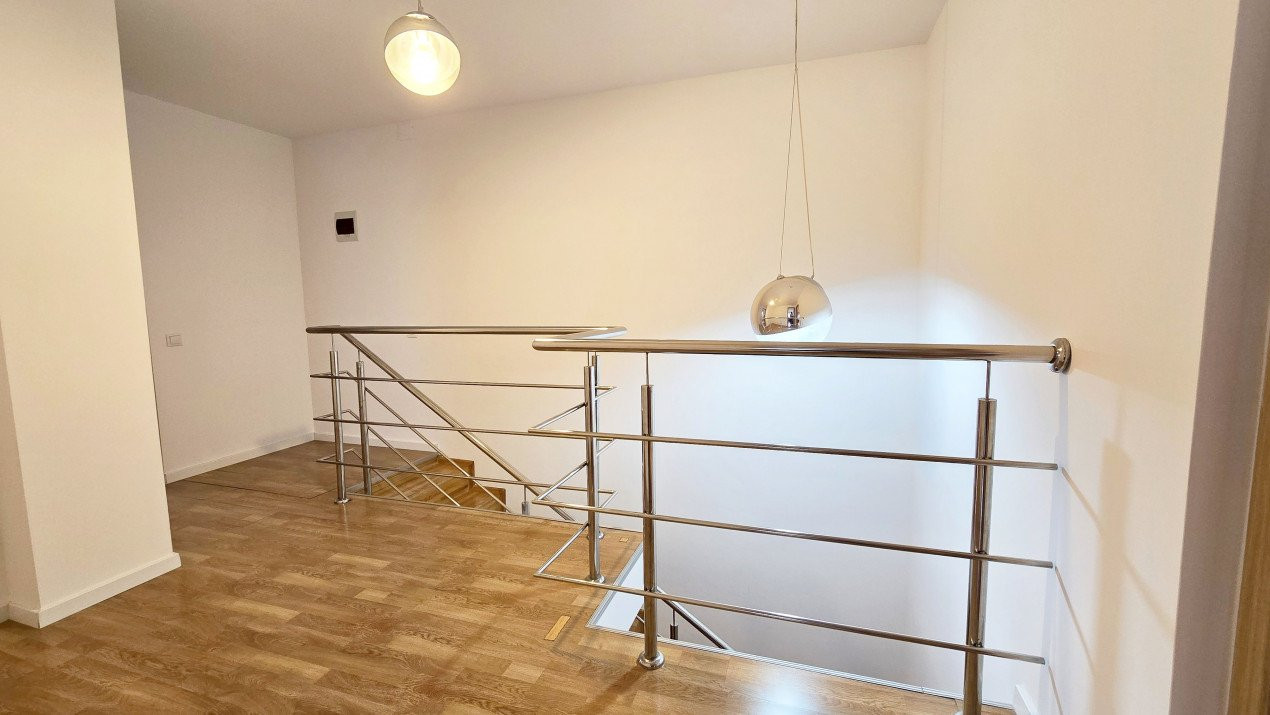 Altfel, casa, pe cat de generoasa si confortabila, este pe atat de intima, atat cat isi doreste orice familie doritoare de liniste si confort sporit. Caci, in completarea livingului imens cu bucatarie deschisa si echipata complet, a dinning-ului si grupului sanitar de la parter, se regasesc la etaj doua dormitoare individuale, o baie si un dormitor matrimonial cu baie proprie, toate in aceeasi nota reconfortanta.