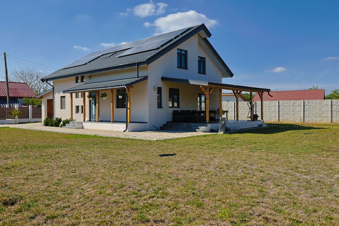 Se oferă la vânzare o vila P+M, 140mp utili, 5 camere, 4 dormitoare, 2 bai. Vila este construita pe o structura de lemn Timber Frame, cu izolație dubla, eficienta energetic și dotata cu panouri fotovoltaice - întreaga casa funcționează pe curent, costuri mici de întreținere.