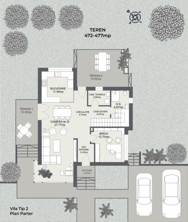 Parterul vilei, cu suprafață utilă de 115 mp (din care 82 mp util locuibili și 33mp terase), este destinat zonei de zi și cuprinde spații generoase, cu suprafețe vitrate imense, prin care te bucuri de peisajul grădinii tale:
