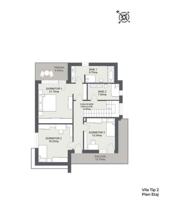 Etajul vilei, cu suprafață utilă totală de 95 mp (din care 76mp utili locuibili și 19mp terase), este dedicat zonei de noapte și cuprinde: