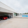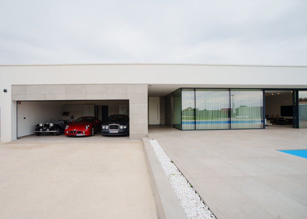 Compartimentarea cuprinde un living deschis către piscină, bucătărie cu zonă de dining, dormitor matrimonial cu dressing și baie en-suite, două dormitoare secundare cu băi proprii, birou, spații de depozitare, garaj pentru trei autoturisme și zone tehnice complet echipate.