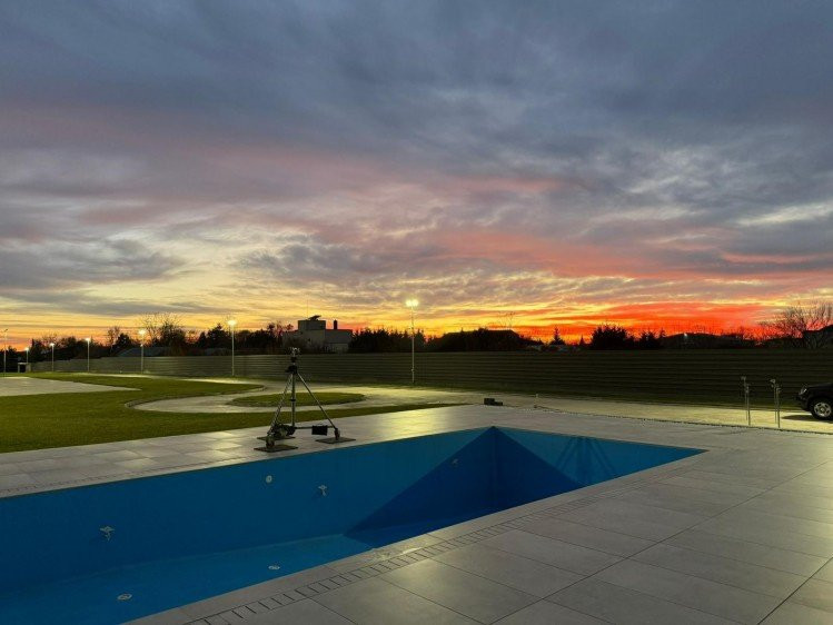 Exteriorul oferă o piscină privată, teren de sport, gazon amenajat, alei pavate și iluminat inteligent cu control smart.