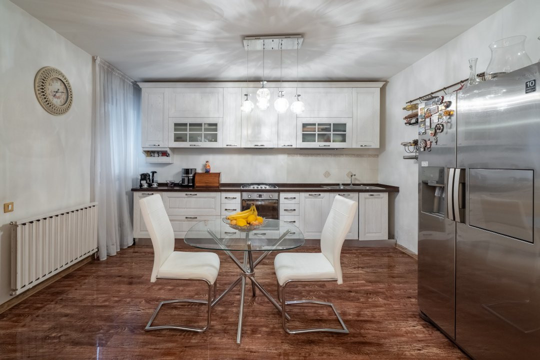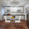 Bucătărie deschisă, modernă, integrată armonios în zona de zi.