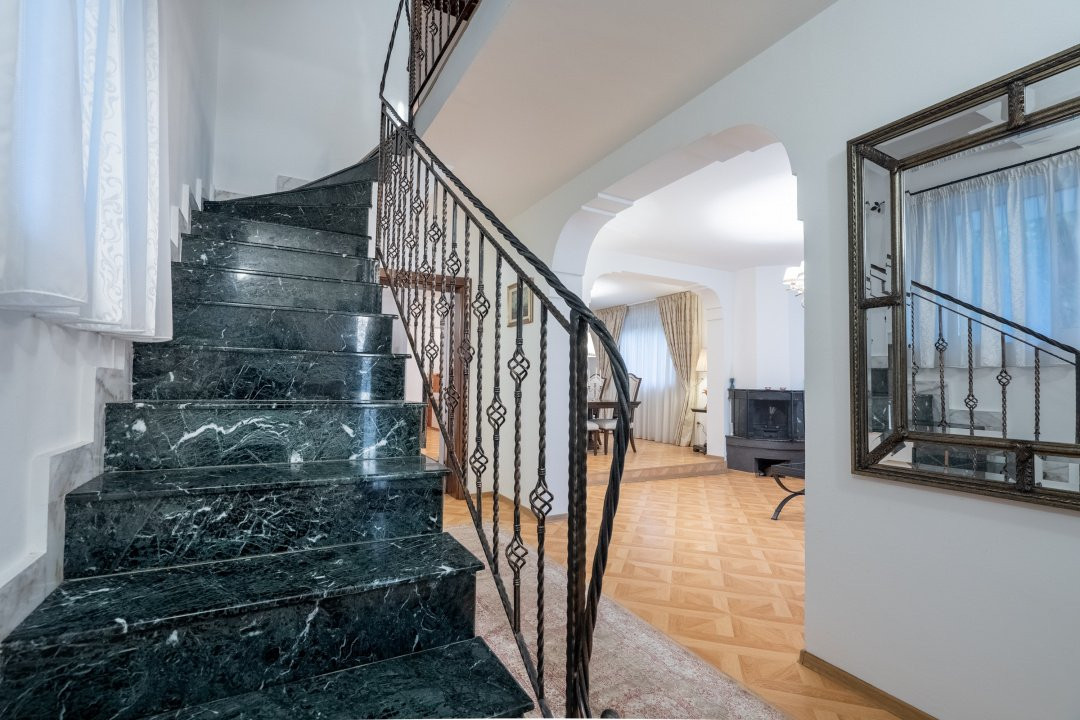 Scări îmbrăcate în granit italian, acoperiș cu țiglă de calitate superioară.