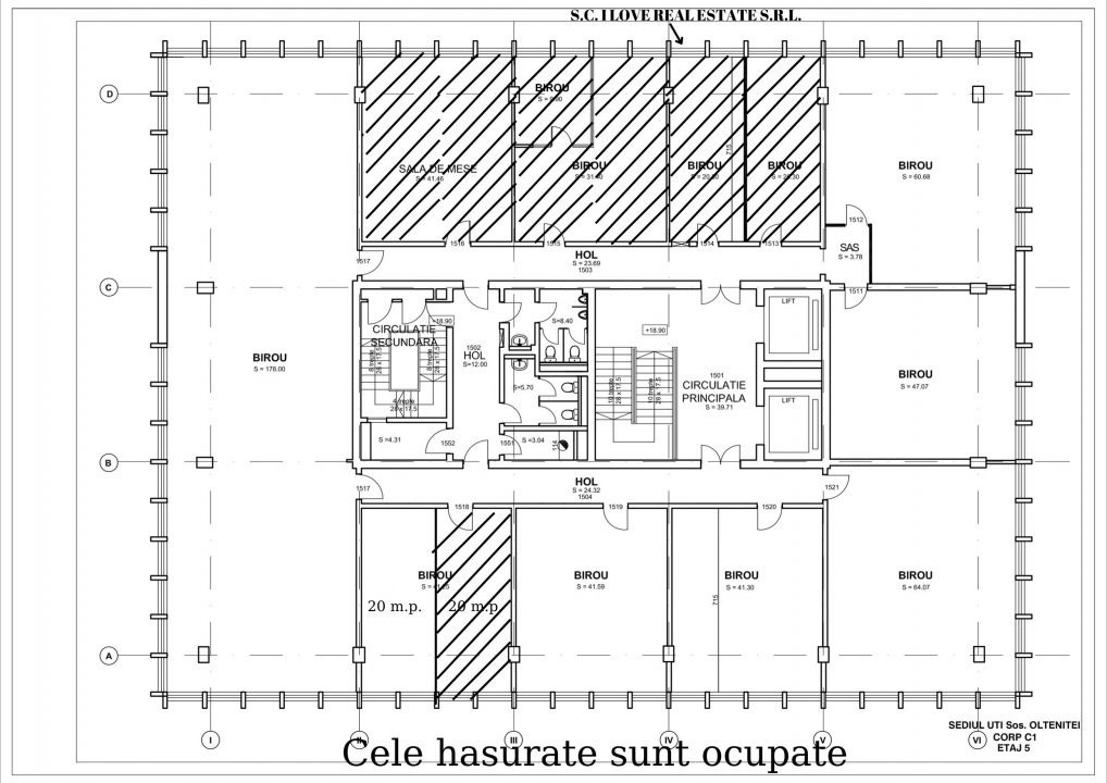 Disponibilitate etaj 5: un spatiu de 20 m.p.; 2 spatii de 40 m.p.; un spatiu de 50 m.p.; 2 spatii de 60 m.p.; un spatiu de 180 m.p..
